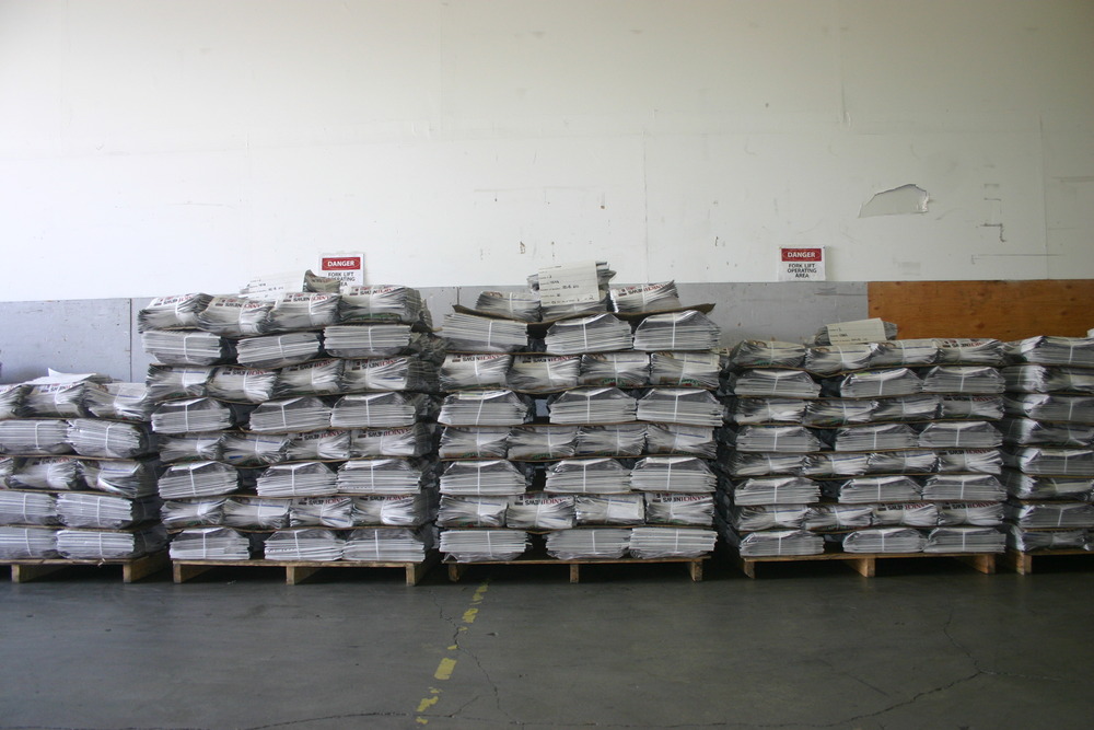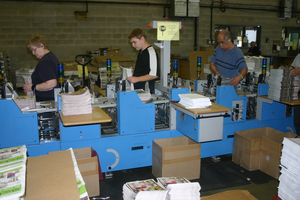 The pages are then cut up into appropriate sizes, organized, stacked together, and then come down a conveyer belt where they are met by “flyboys” who stack them on skids. They get picked up, inserted through yet another machine where fliers are inserted and then everything is bundled up, loaded into awaiting vans, and ready for distribution.