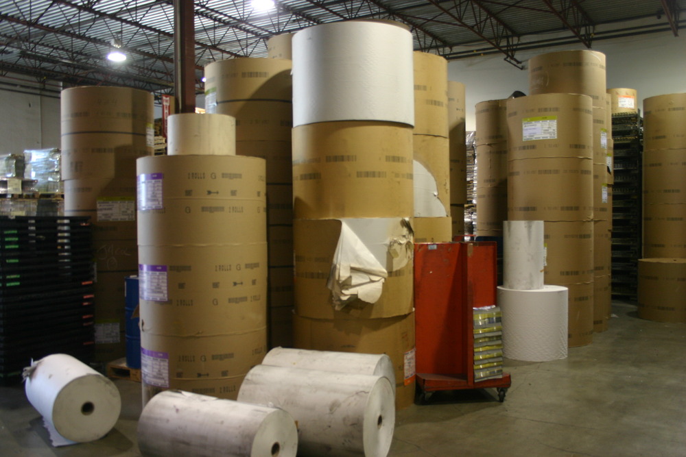 The building is massive—giant cylinders each holding 1,000 kilograms of black ink are huddled in the corner, next to flat upon flat of piled up fliers waiting to be inserted into various titles. The whirring, buzzing and beeping of equipment stretching down the entire length of the hangar-like complex make conversations difficult, if not impossible, at times.